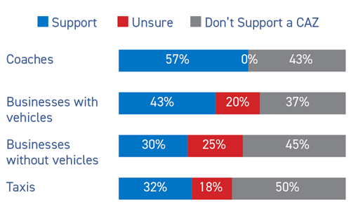 A small majority of businesses who operate their own vehicles (43%) support the CAZ with 20% unsure and 37% not supporting it.