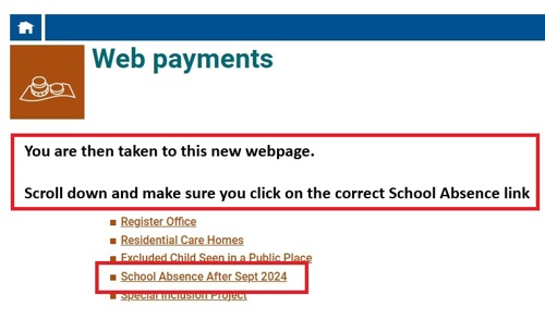 - You'll then be taken to the 'Web payments' webpage. Scroll down the page and find 'School Absence After Sept 2024'. Click on 'School Absence After Sept 2024'.