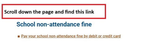 - Scroll down the page, find 'School non-attendance fine', and click on 'Pay your school non-attendance fine by debit or credit card'.